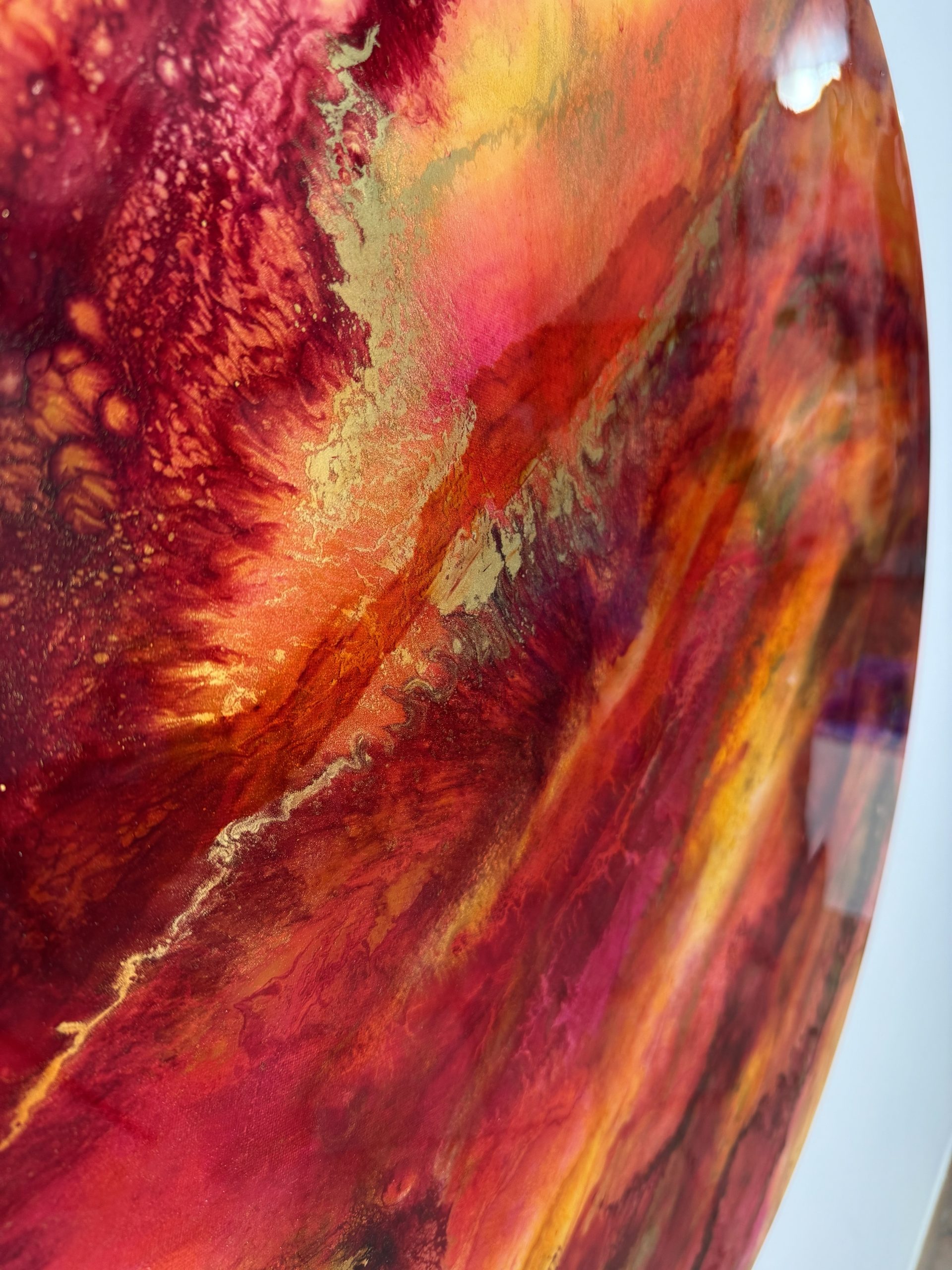 Tela circolare che vibra con toni di magenta, oro e arancio, evocando il Raggio Oro-Rubino nella sua espressione più vitale. Il formato rotondo amplifica la sensazione di un sole interiore che irradia abbondanza, amore e gratitudine.